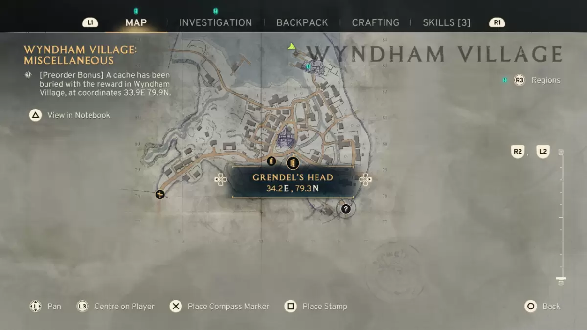 Добравшись до деревни Уиндем, вы обнаружите три специальных задания, помеченных как бонусы предзаказа. Самое простое из них называется «Новые предметы для торговли», которое направляет вас к Алфу в пабе «Голова Гренделя». Вы найдете это заведение в юго-восточной части Уиндема, недалеко от Скезермура, по координатам 34.2 в.д., 79.3 с.ш.